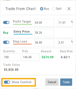 When trading from the Chart (OCO orders), you can elect to Show Confirmation – or not.